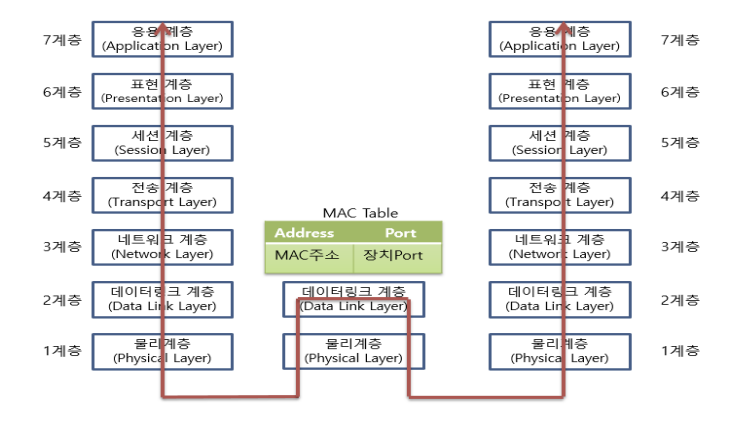목적: 서로 다른 주변 네트워크 장치들이 데이터를 주고 받을 수 있도록 한다. 프레임을 전달하기 위해 MAC주소 기반의 MAC TABLE가 존재한다. 필요에 따라 데이터를 3계층에 전달한다.