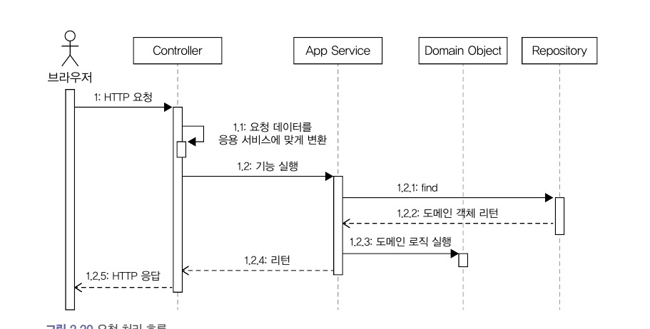 요청 흐름 처리는 소프트웨어의 실행 요청이 처음 발생하는 지점인 표현 영역(컨트롤러)부터 시작됨. 표현 영역은 사용자의 HTTP 요청을 받아서 해당 요청을 응용 영역으로 전달하고. 응용 영역은 도메인 모델을 이용하여 실제 기능을 구현하며, 필요한 도메인 객체를 리포지토리에서 가져와 실행하거나 새로운 도메인 객체를 생성하여 리포지토리에 저장할 수 있다. 이를 통해 표현 영역과 응용 영역 간의 역할을 분리하고 도메인 모델을 적절히 활용한다.