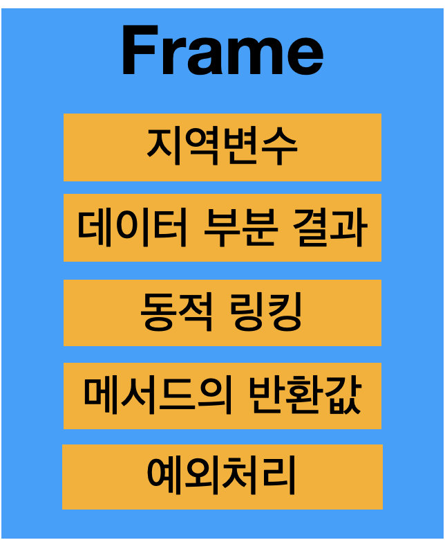 프레임은 메소드 호출에 필요한 데이터 및 부분 결과를 저장하는데 사용됩니다. 또한 동적 링킹, 메서드의 반환 값, 예외 처리 등의 작업을 수행합니다. 이는 각 메소드 호출의 실행 컨텍스트를 유지하고 관리하는 데 중요한 역할을 합니다.