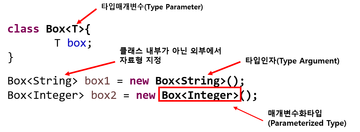 제네릭이란 컴파일 시점에 형타입을 검사함으로써 런타임에 오류를 방지하기 위해서 사용된다.