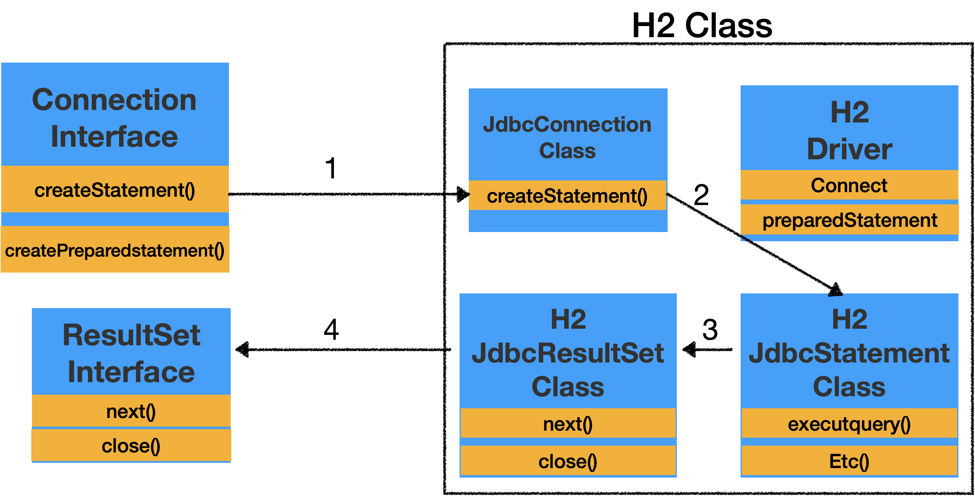 Driver를 관리하는 것이 DriverManager입니다. 클래스 로더가 각 벤더사가 구현한 Driver 클래스를 로드하게 되고, DriverManager가 각 벤더사의 connect 함수를 통해 데이터베이스에 접속을 시도합니다. 연결이 성공하면 Connection 객체를 반환하게 됩니다.