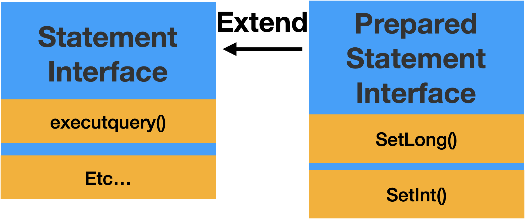 데이터베이스에 접속하는 방법은 표준화되었지만, 쿼리를 실행하는 방법도 표준화되어야 합니다. 각 벤더마다 쿼리를 날리는 방식이 다를 수 있기 때문에 자바 진영에서는 Statement와 PreparedStatement 인터페이스를 이용하여 이를 표준화했습니다. PreparedStatement는 쿼리 파라미터를 설정하여 DB로 쿼리를 날릴 수 있는 점에서 Statement와 차이가 있습니다.