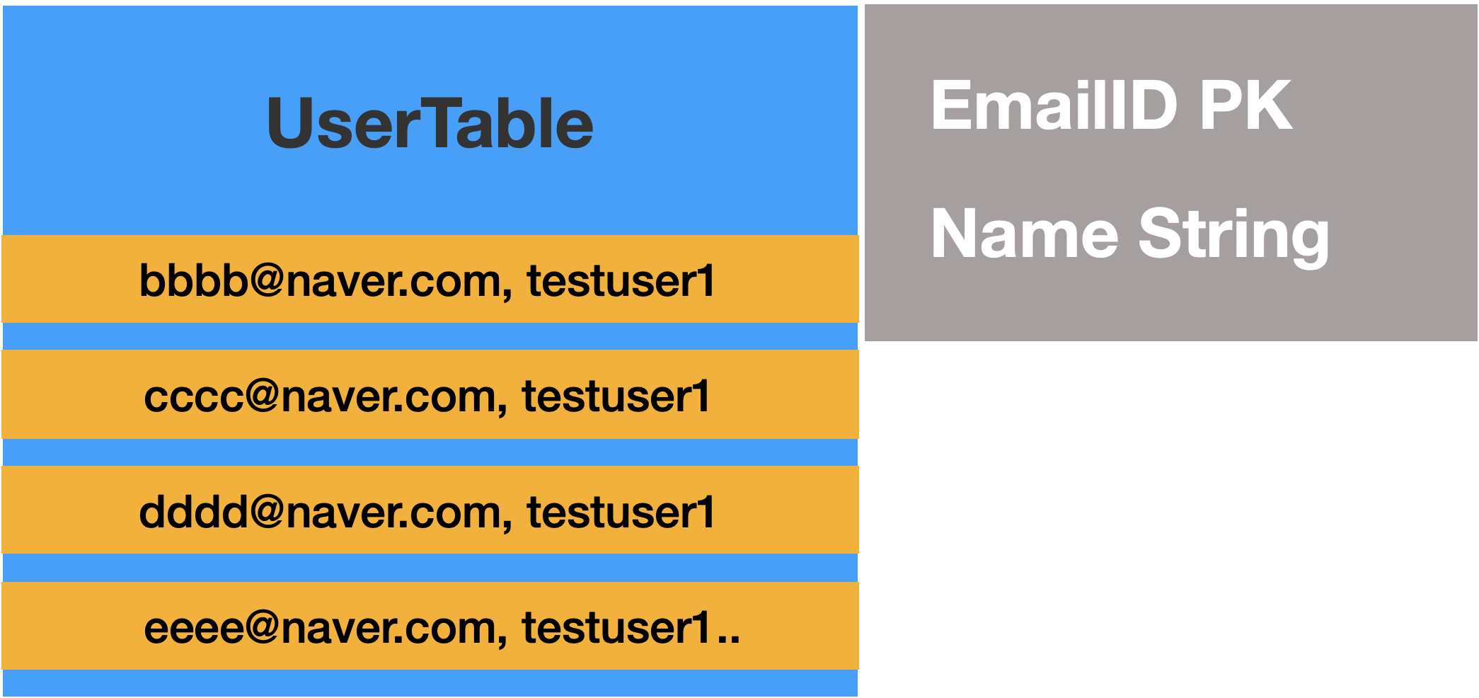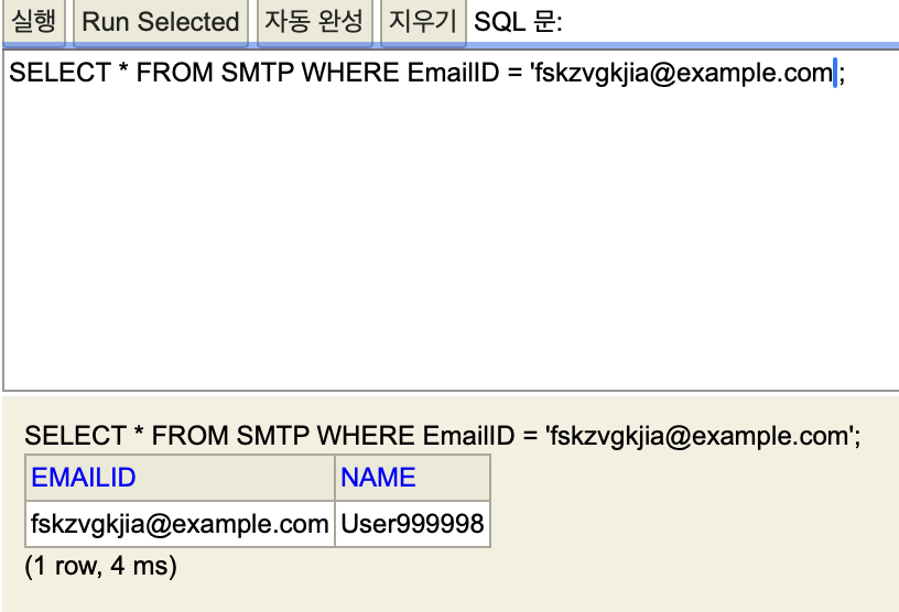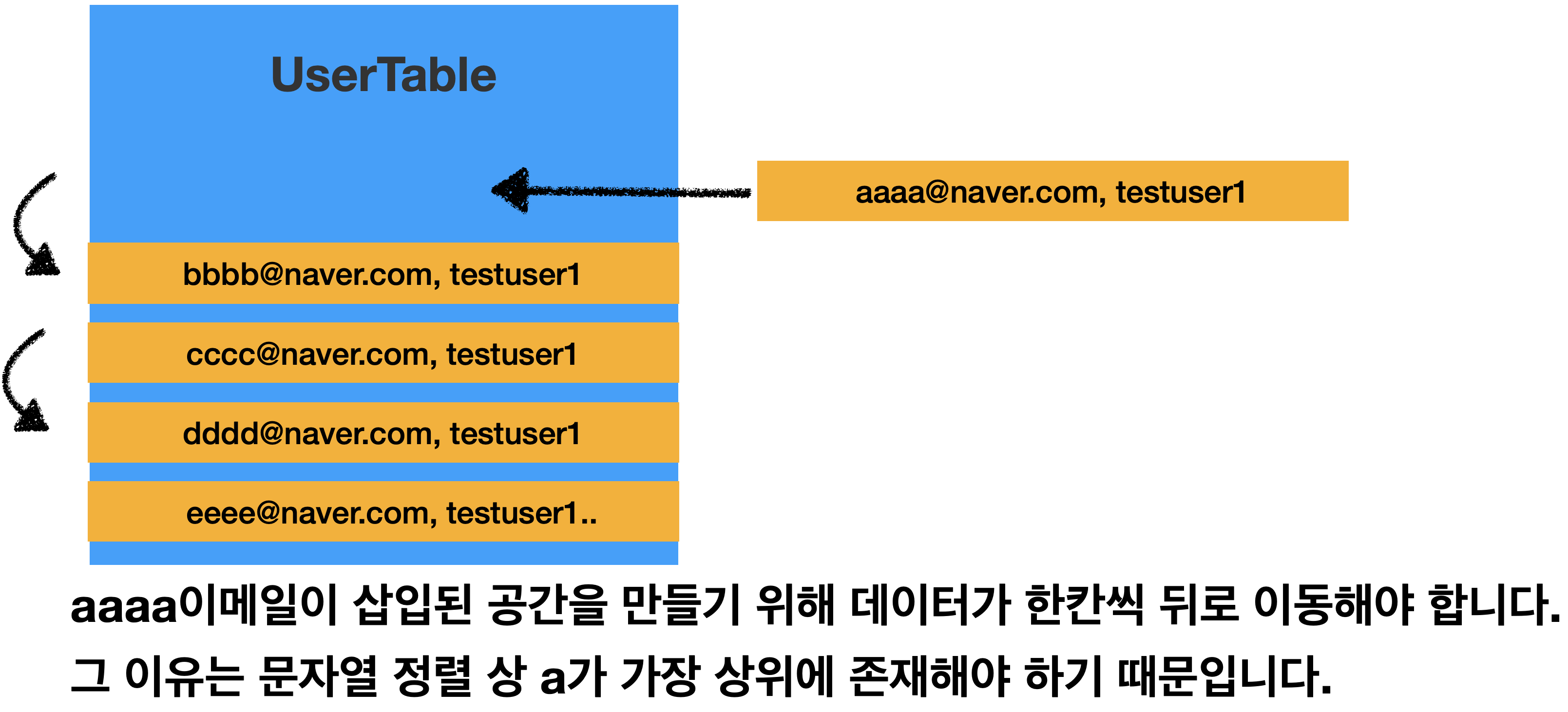 만약 UserTable에 데이터가 아래의 그림과 같이 존제하고, "aaaa@naver.com, testuser1"을 넣어야 한다면 어떻게 동작하게 될까요?
