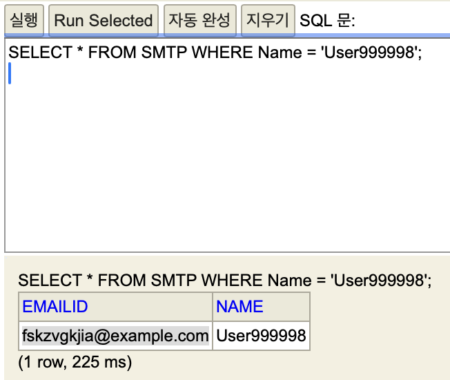 10만 건을 기준으로 조회했을 때 성능 차이가 상당히 심한 것을 확인할 수 있다. 같은 데이터를 Name으로 조회했을 땐 225ms가 걸렸지만 email로 조회했을 땐 4ms가 걸렸다