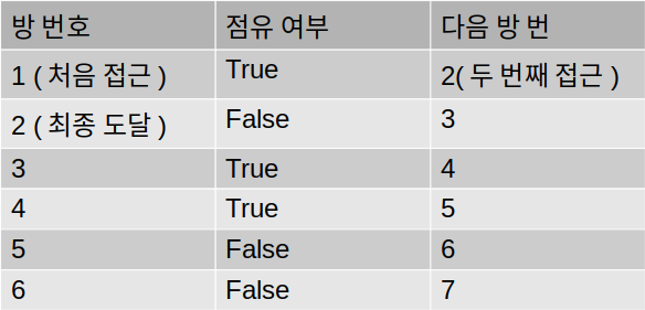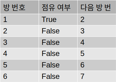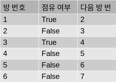 다음으로는 방의 점유 여부를 표시하기 위해서 해당 room_number을 key로 하고 value는 [점유여부, 다음 방 번호]를 가지는 dict 클래스를 생성했다.