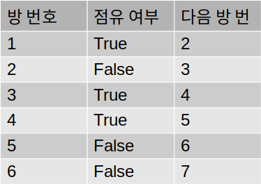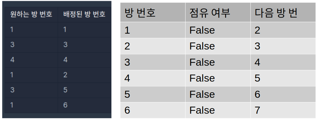 여기서 세 번의 연산을 수행하게 되면 아래와 표가 아래와 같이 변한다. 이제는 사용자가 원하는 방번호에 배정을 해줄 수 없는 상태가 된다. 여기에서 다음 방 번호를 빨리 찾기 위해서는 사용자가 원하는 방번호에서 다음 방 번호에 접근해 점유 여부를 확인한 후 사용자에게 방을 배정할 수 있다.