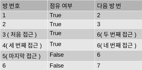 #3번에서는 해당 방이 사용 중이면 해당 방의 다음 방 번호로 접근해 준다.