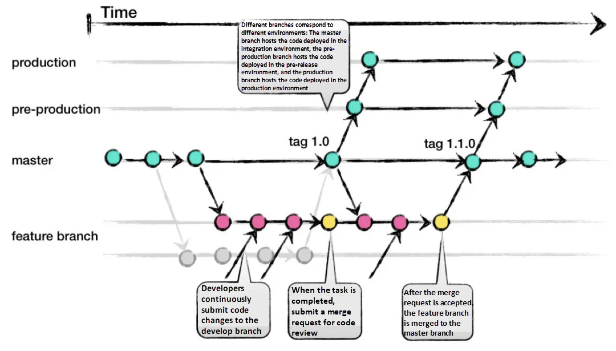 - production: 실제 운영 환경에 배포되는 코드를 관리합니다.