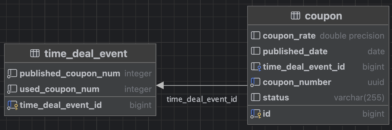 - Time_Deal_Event (1) -> Coupon (N): 하나의 Time_Deal_Event가 여러 개의 쿠폰을 발급할 수 있는 일대다 관계입니다.
