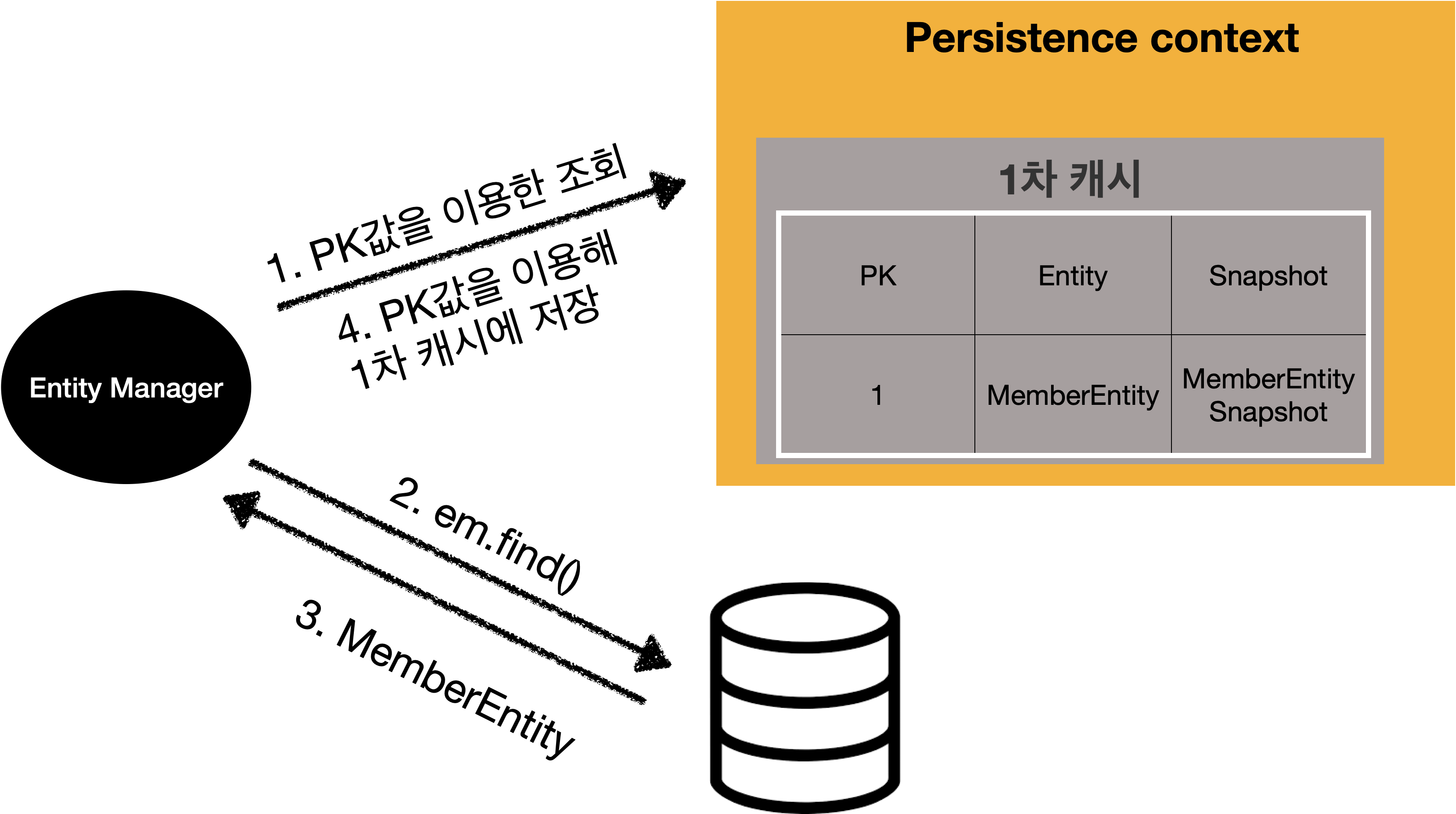 - 처음 데이터를 조회할 때, 데이터가 1차 캐시에 없으면 데이터베이스에 쿼리를 전송해 데이터를 불러옵니다.