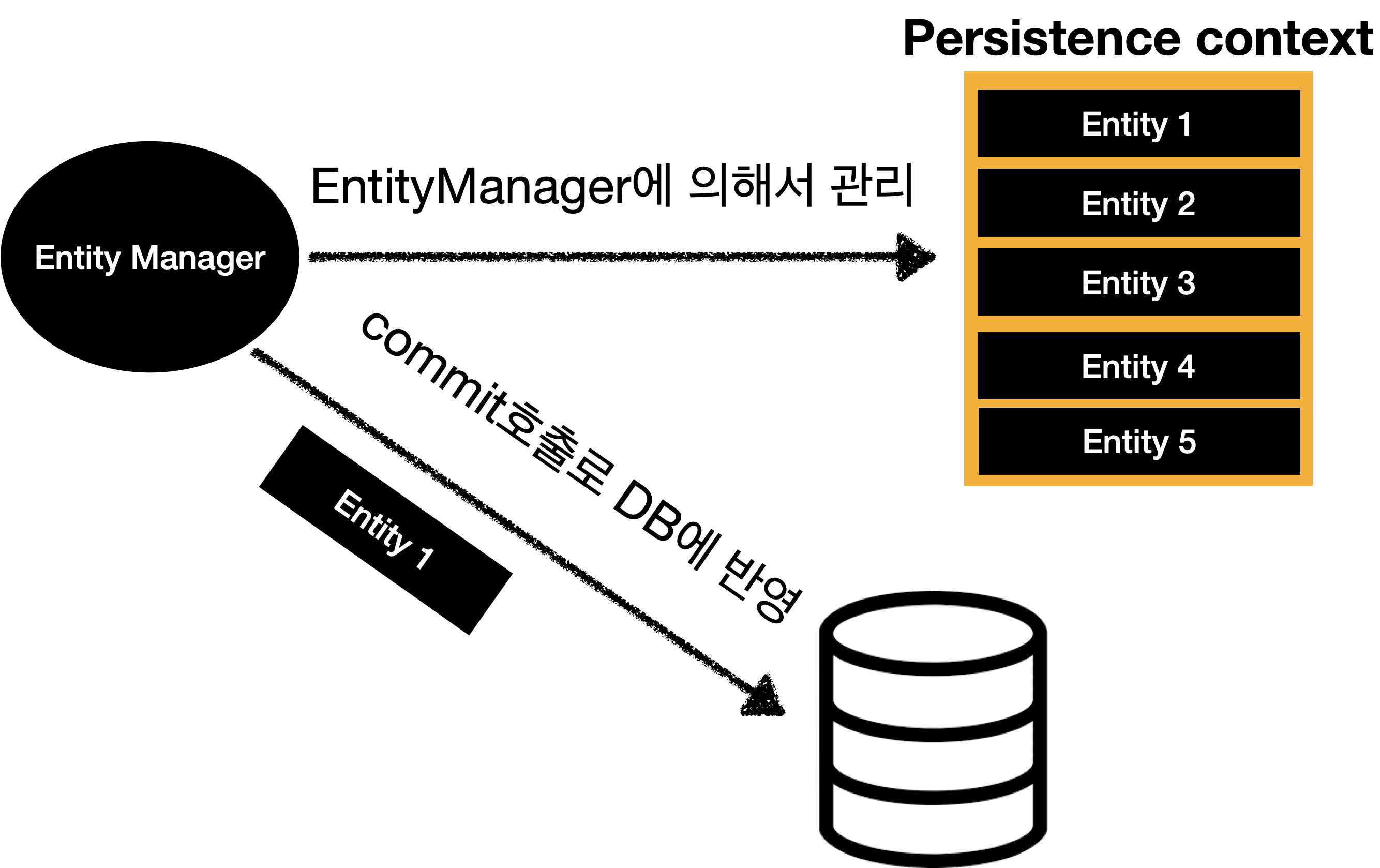 영속성 컨텍스트는 논리적인 개념으로, 영속성 엔티티들의 집합을 의미합니다. JPA에서는 EntityManager를 통해 영속성 엔티티들이 데이터베이스에 반영됩니다.