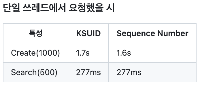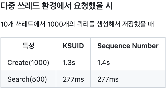 저는 KSUID를 선택하게 됐습니다. 아래는 성능을 테스트한 표인데, KSUID가 근소하게 더 빠른 면이 있었고, 분산처리 환경에서도 전역적인 고유성을 보장함으로써 나중에 scale-out을 통해서 실행했을 때도 sequence table의 병목을 해결할 수 있을 것 같았습니다.