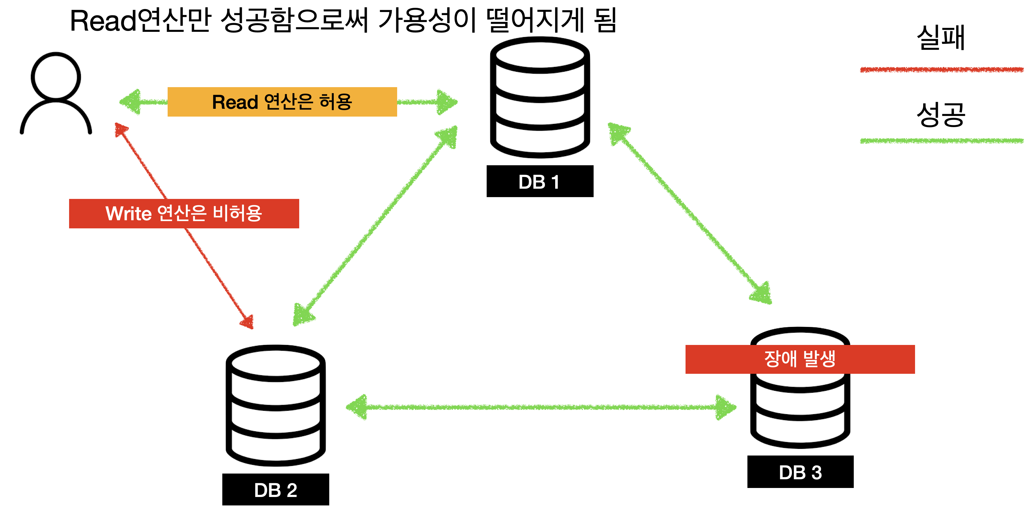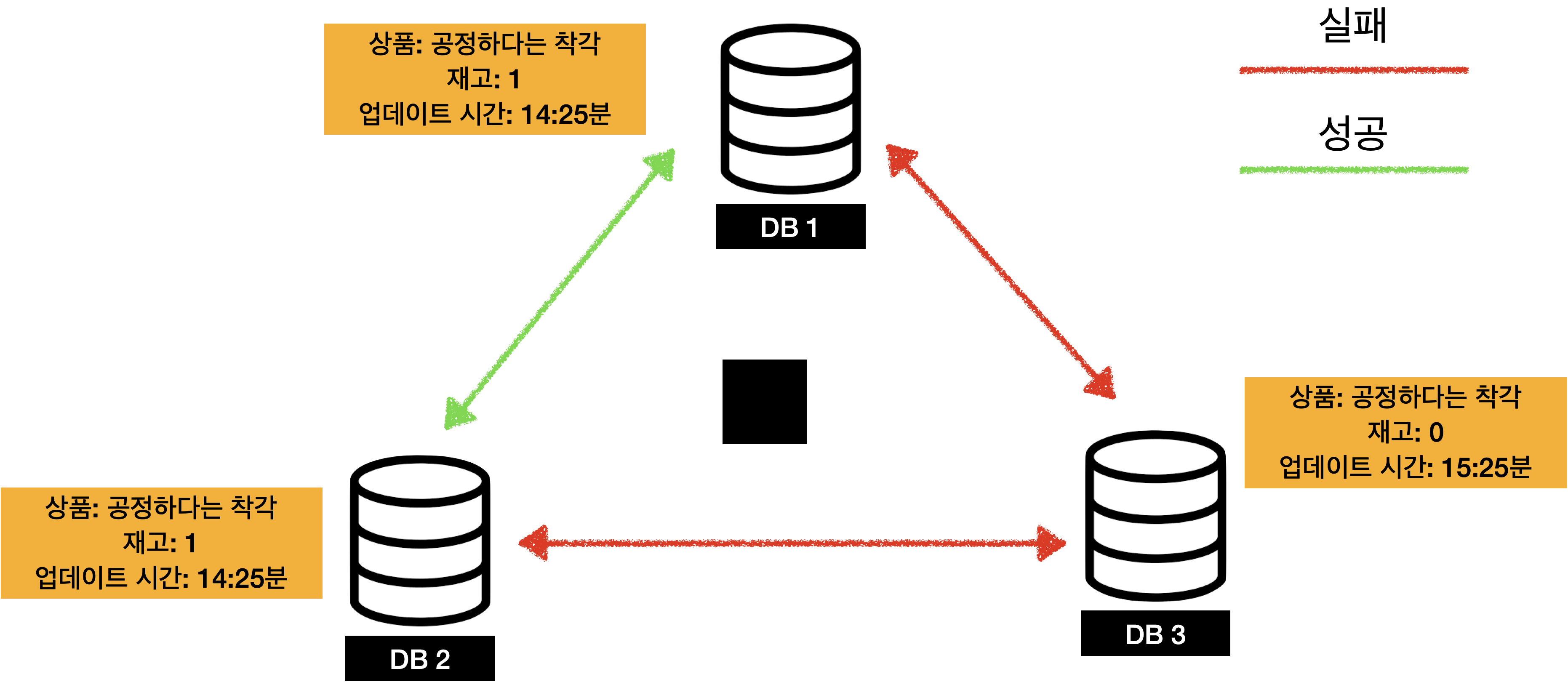 여기서 중요한 점은 바로 아래의 그림과 같은 상황입니다. 네트워크가 고장난 노드에 최신 데이터 write가 됐고, 그 후 네트워크 장애가 생격 DB1, DB2에 재고 수량이 다른 데이터 일관성 문제가 생겨나게 됩니다.