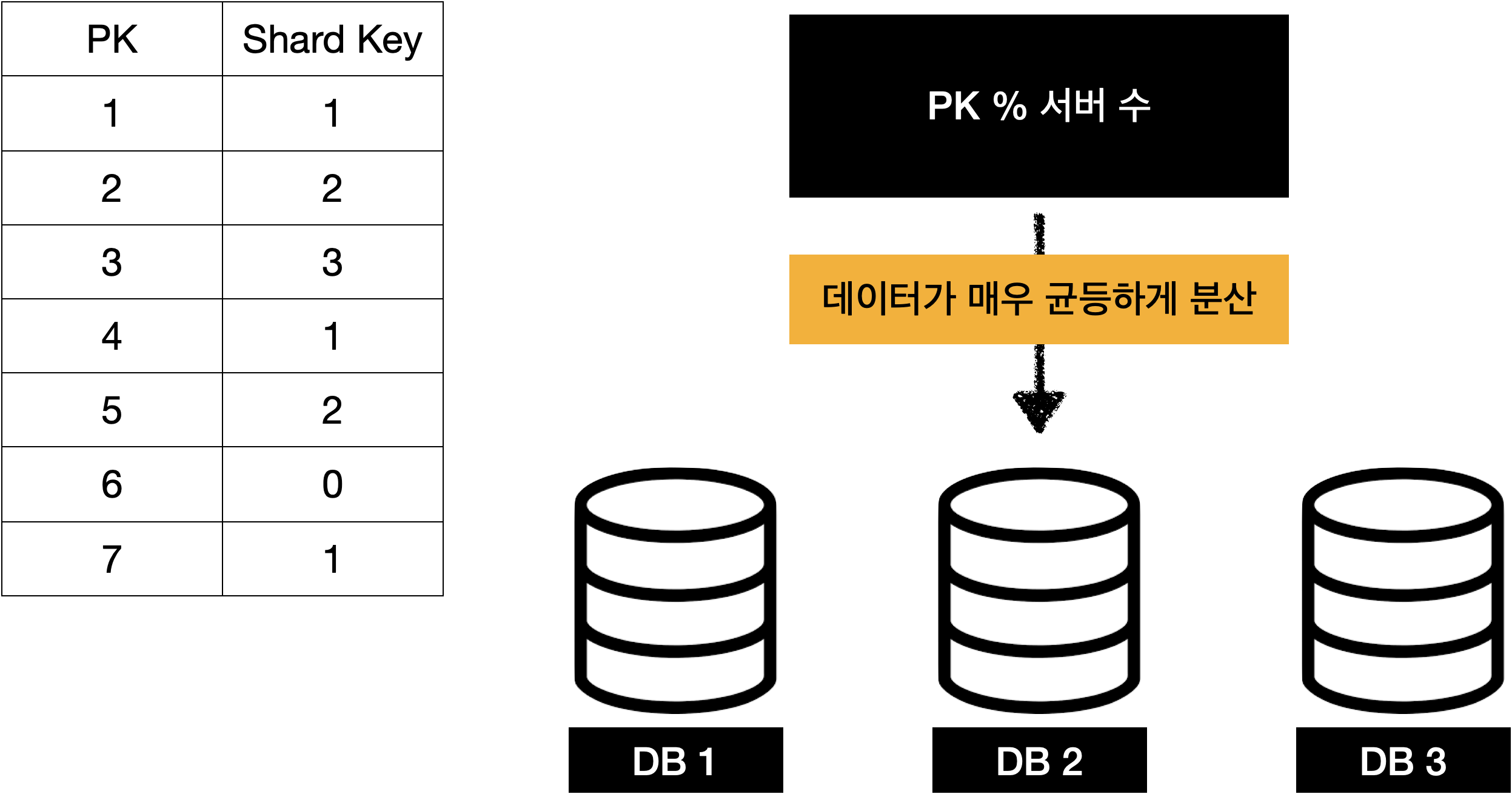 하지만 치명적인 약점이 존제하는데 서버가 추가되거나, 삭제되면 모든 샤드키가 변경되게 됩니다. 이는 데이터의 조회 시 다른 샤드를 참조할 수 있기 때문에 서버가 추가되거나 삭제되면 샤드에 맞게 데이터를 재정렬하는 상황이 생기게 됩니다.