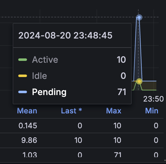 프로메테우스를 통해 분석한 결과, DB 커넥션 풀이 10개뿐이라 요청이 몰릴 경우 모든 커넥션이 활성화되고 대기 요청이 쌓이는 현상이 발생했습니다.
