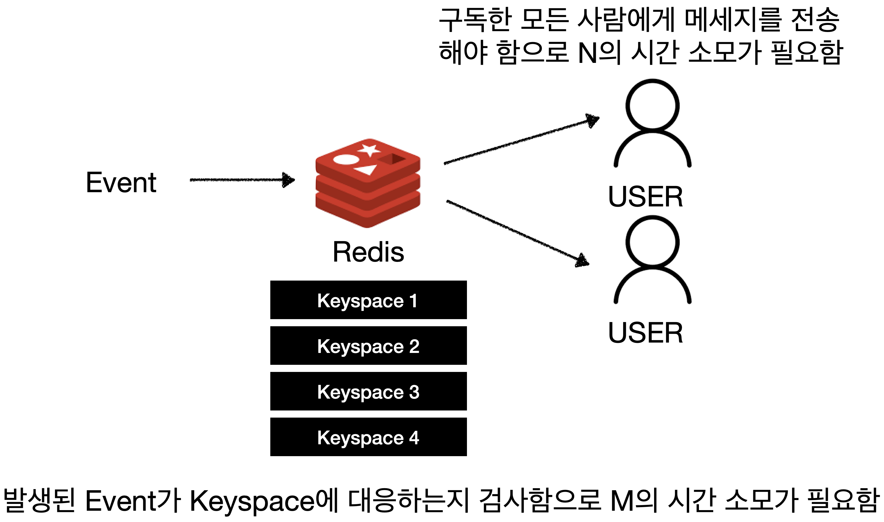 Redis는 PUBLISH 명령어를 사용해 이벤트를 채널에 전송합니다. 이 명령어의 동작 속도는 O(N+M)입니다. 여기서 N은 해당 채널에 구독된 클라이언트 수, M은 패턴 구독의 총 수를 의미합니다. 이 속도는 이벤트가 발생할 때 Redis가 모든 패턴 구독(M)을 먼저 검사하고, 그다음 해당 채널에 구독된 모든 클라이언트(N)에게 메시지를 전송해야 하기 때문에 O(N+M)의 시간이 소모됩니다.
