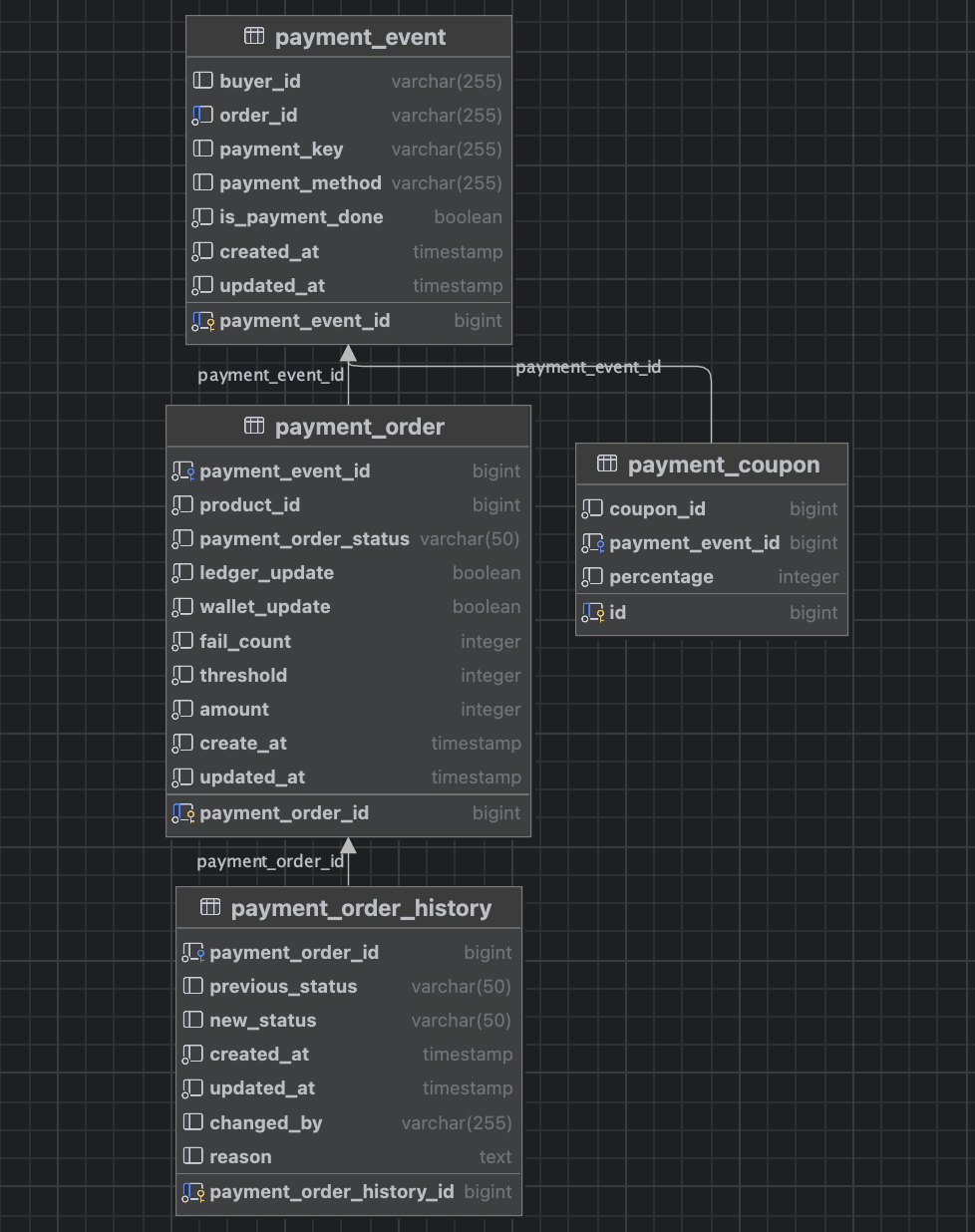 - payment_event 테이블은 payment_order와 payment_coupon 테이블과 1:N 관계를 가집니다. 즉, 하나의 결제 이벤트는 여러 개의 주문 또는 쿠폰과 연결될 수 있습니다.