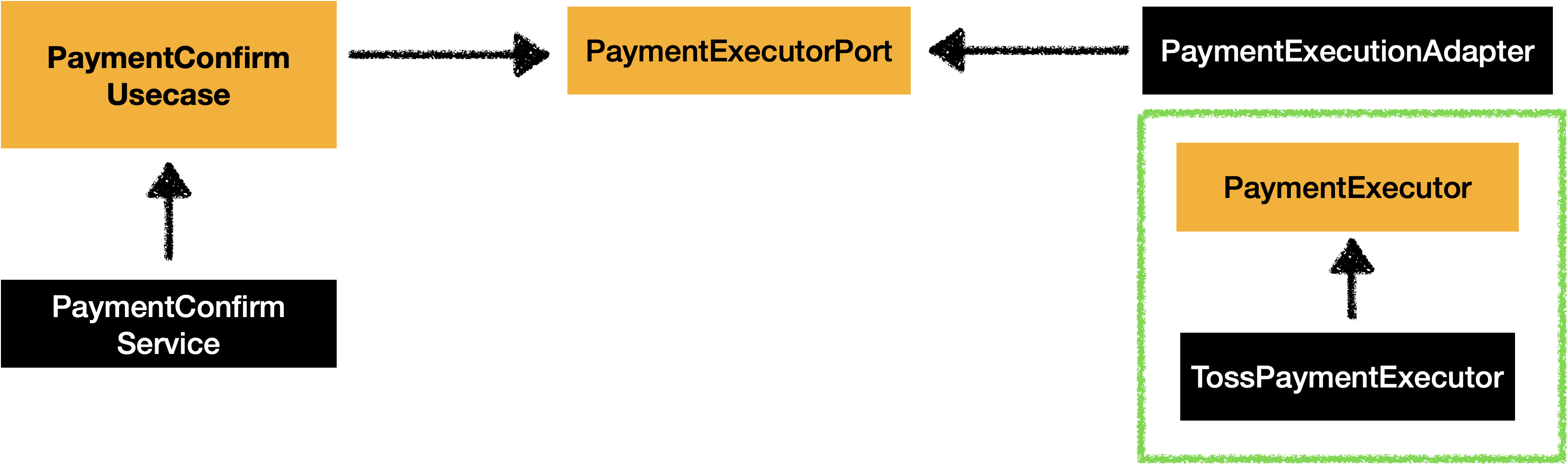 결제 승인 구조는 포트와 어댑터 패턴을 사용하여 설계되었습니다. 이 패턴을 사용한 이유는 여러 결제 시스템을 유연하고 확장 가능하게 처리하기 위해서입니다.
