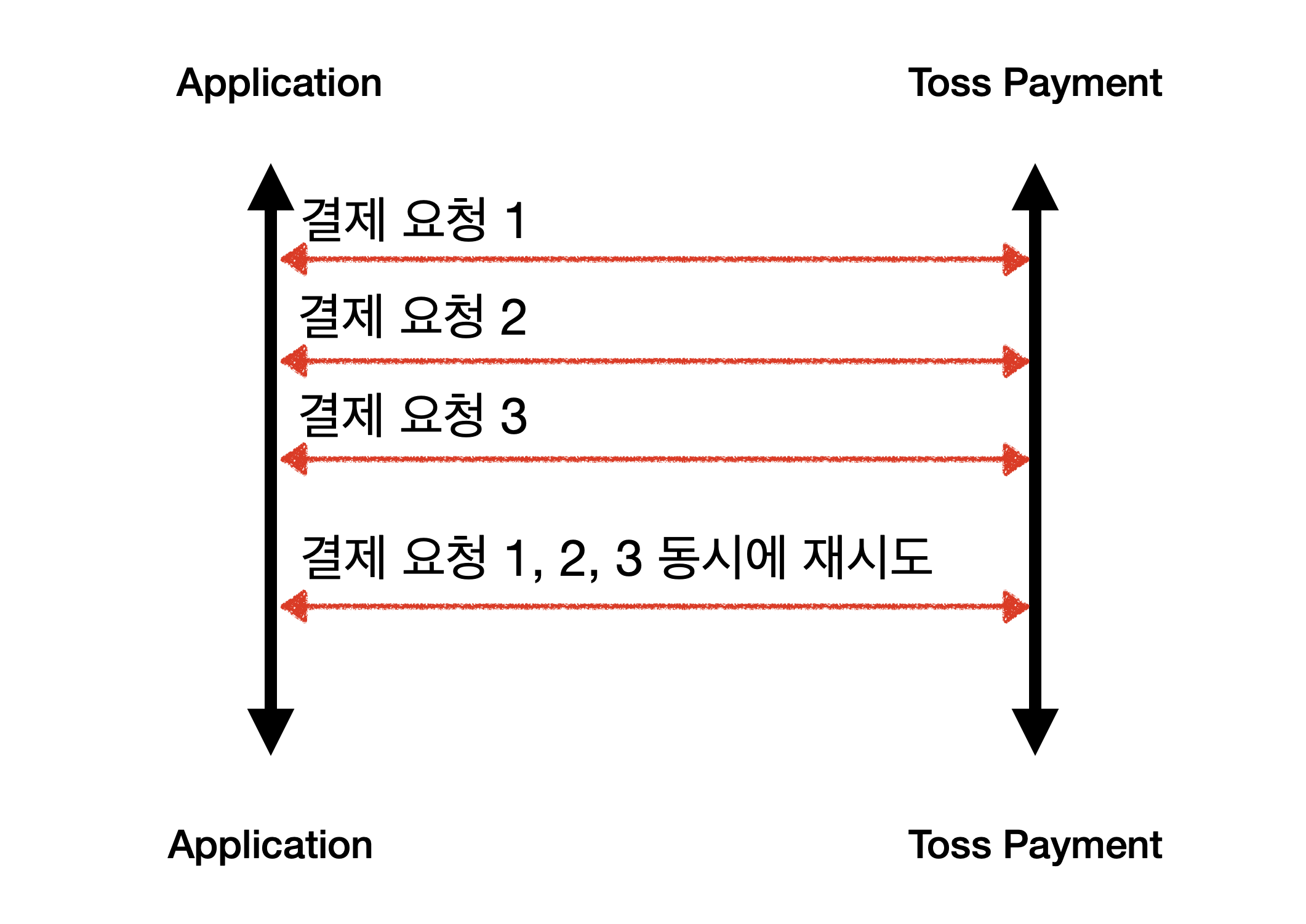 아래 그림과 같이 결제 실패 요청을 모아서 일정 시간마다 한꺼번에 재시도하는 방식으로 결제를 처리한다고 가정해 보겠습니다. 이러한 방식은 다음과 같은 문제를 일으킬 수 있습니다: