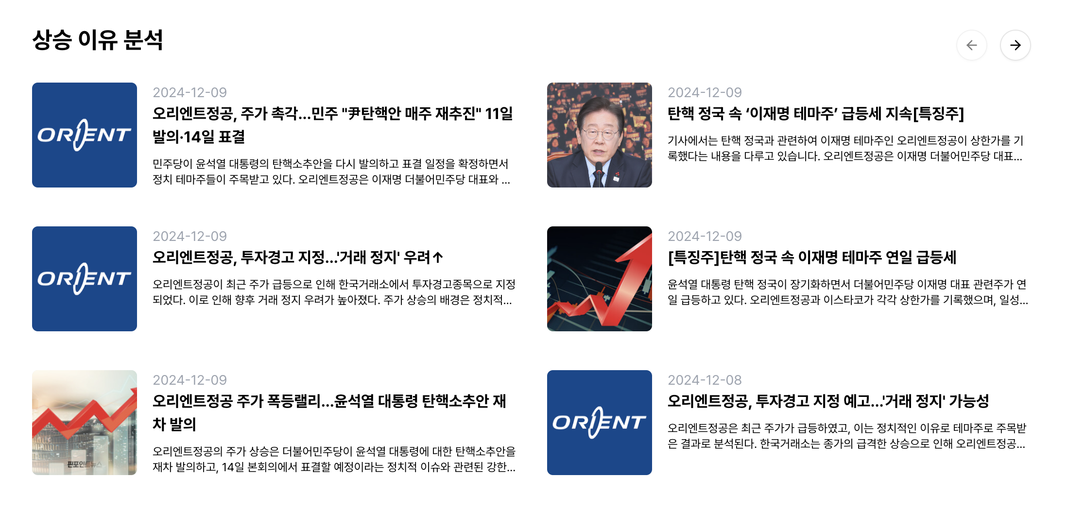 - 특히, 2024-12-09일 주가 상승 이유는 **"탄핵", "이재명"**이라는 공통된 주제로 요약될 수 있음에도 불구하고, 중복된 뉴스가 다수 표시되어 불편함을 초래했습니다.