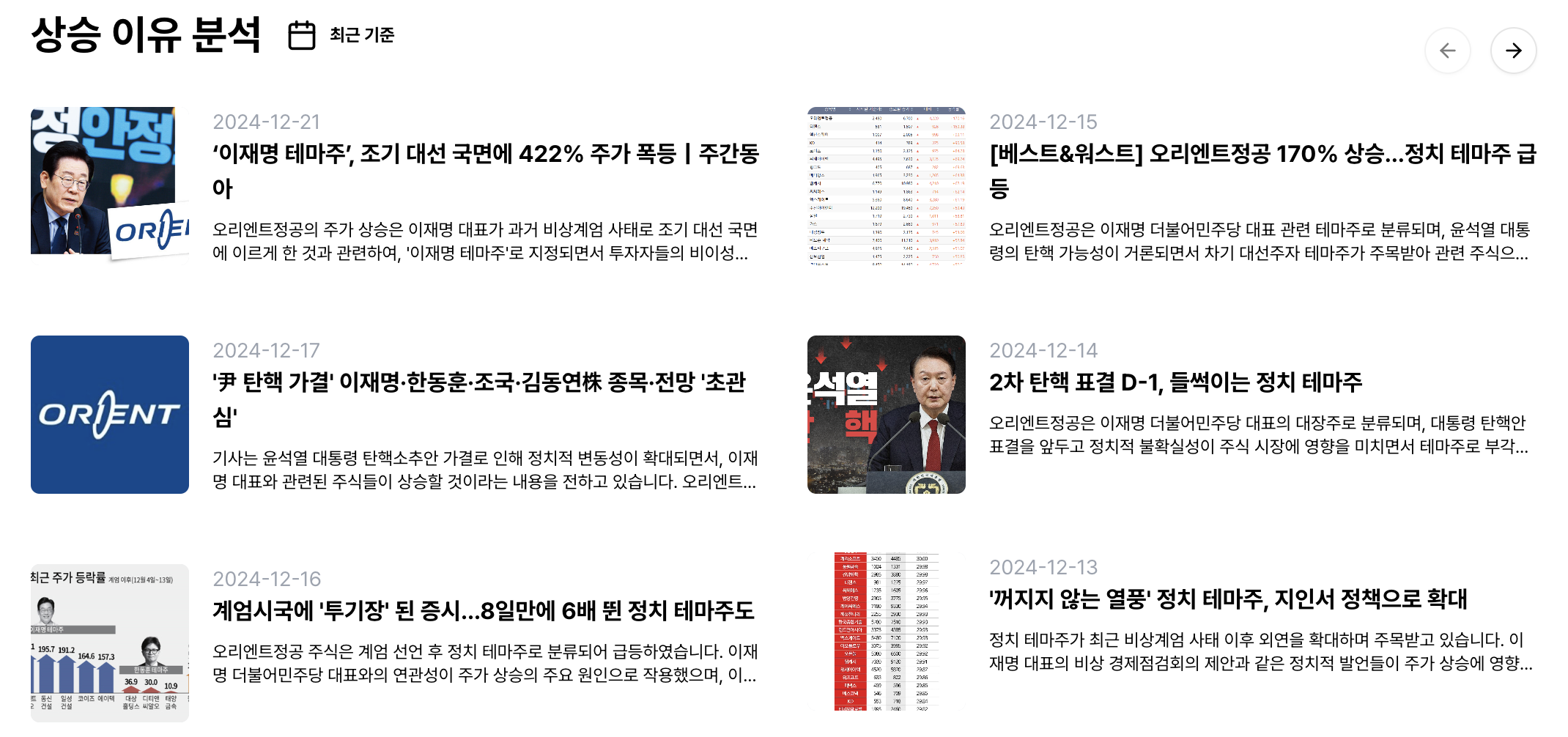 오리엔트정공과 같은 특정 주식의 상승 이유를 설명하는 뉴스를 제공할 때,
