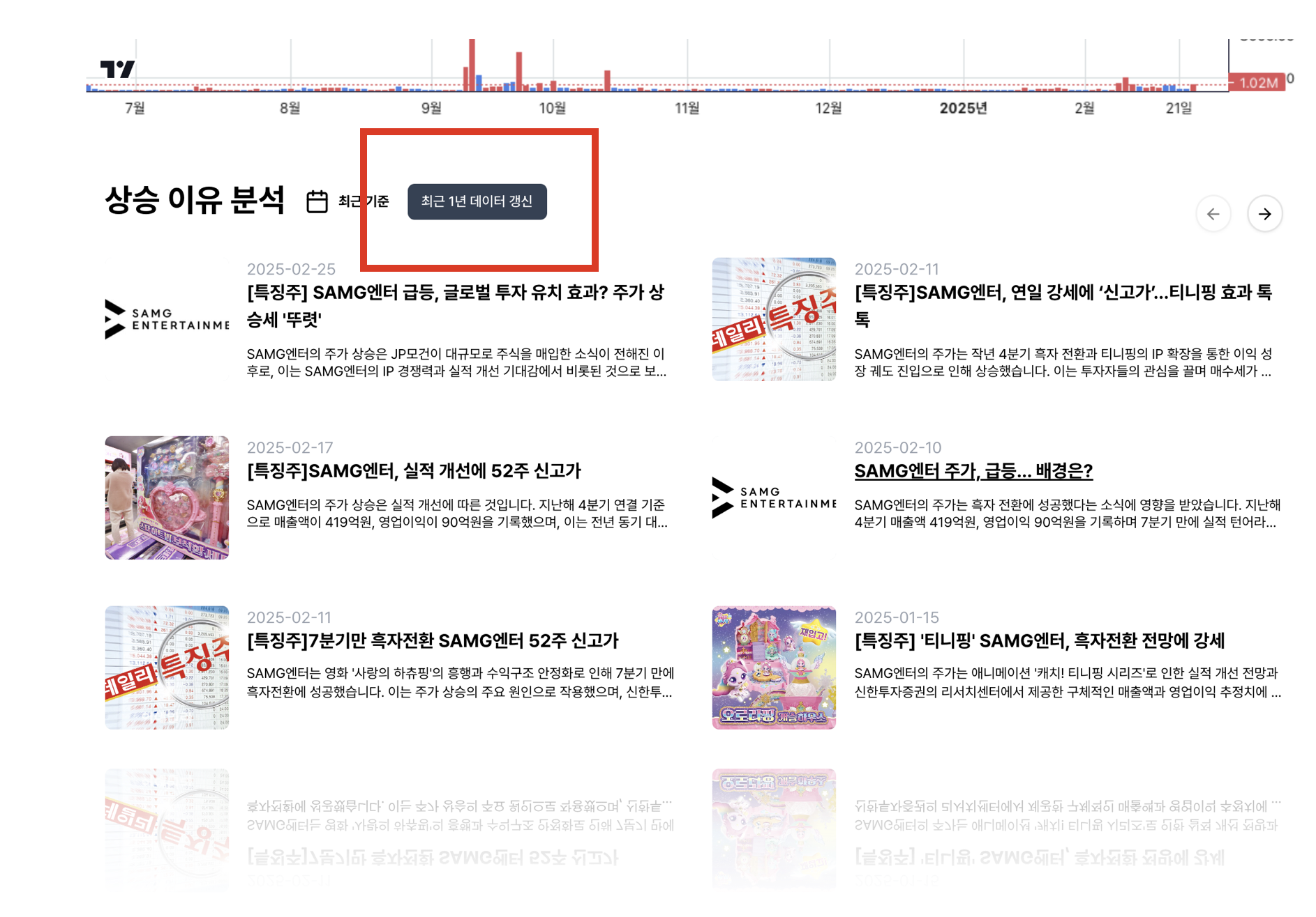 아래의 빨간색 버튼은 사용자가 특정 주식 정보를 갱신하기 위한 버튼입니다. 해당 버튼을 클릭하면 뉴스 업데이트가 진행되며, 서버에 정보 갱신 요청이 전달됩니다. 서버는 요청을 비동기적으로 처리하기 때문에 즉시 응답을 프론트엔드에 전송하고, 프론트엔드는 폴링(polling) 방식을 통해 갱신 완료 여부를 지속적으로 확인합니다.