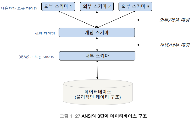 - 외부스키마: 여러 개의 사용자 관점으로 구성, 각 사용자가 보는 개인적 DB스키마