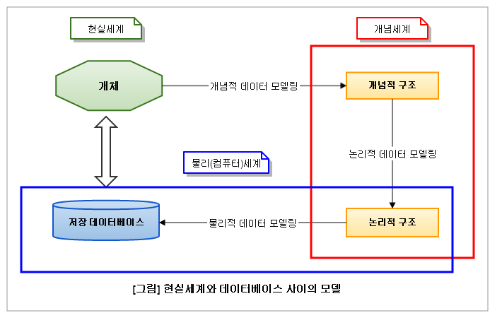 - 개념스키마: 모든 사용자 관점을 통합한 조직 전체 DB와 그들간의 관계를 표현한 스키마