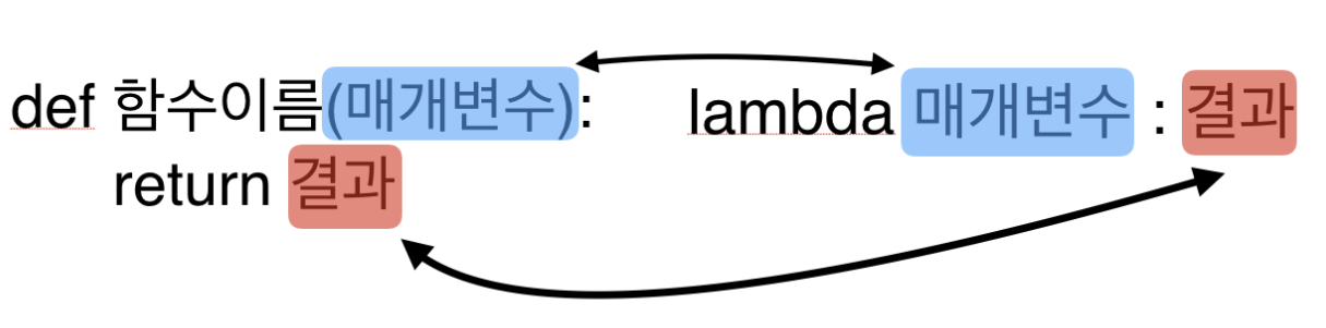 람다(lambda) 함수는 파이썬에서 익명 함수(anonymous function)를 만들기 위해 사용됩니다. 익명 함수란 이름이 없는 함수로, 일회성으로 사용될 때 유용합니다.