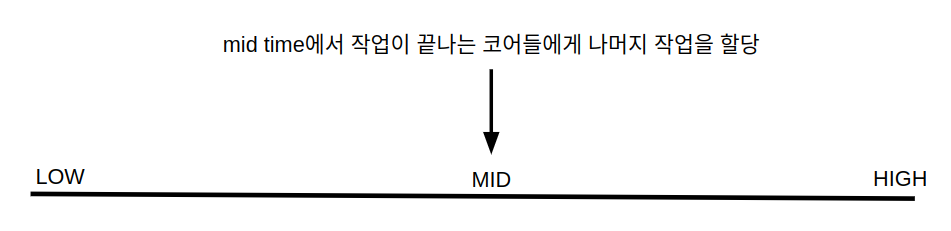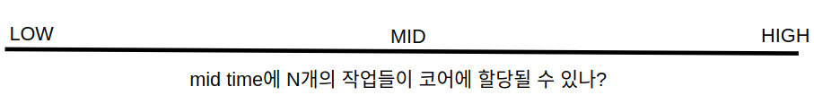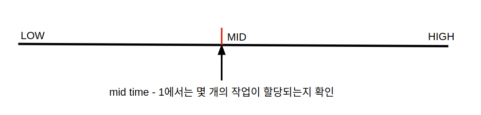 우선 이 문제를 풀기 위해선 모든 작업들이 코어에 할당되는 최소 시간을 찾아야 합니다. 이를 빠르게 찾기 위해 이분탐색을 사용했습니다.