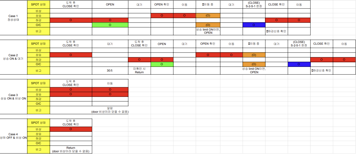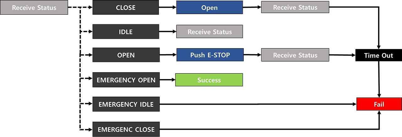 로봇이 정해진 waypoint에 도착하면 ROLL-UP DOOR의 상태를 확인하기 위해 아두이노와 통신합니다. 로봇은 초기 상태 정보를 받으면 이를 통해 4가지 CASE 중 하나를 선택하여 적절한 동작을 수행하게 됩니다.